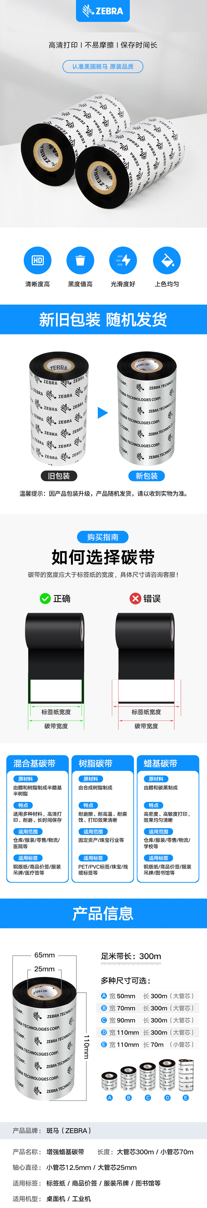 | 3200 | 混合基 | 黑色 | 有突出的打印質(zhì)量和非常好的抗化學(xué)腐蝕能力和抗溶解能力. 當(dāng)打印在斑馬紙簽和合成材料標(biāo)簽上時有很好的抗油污和抗刮擦性. 在惡劣的環(huán)境下,有很好的持久性使用范圍:適合于銅版紙, 合成紙規(guī)格:40/60/80/110/131/156/220mm(W)×450m(L) |